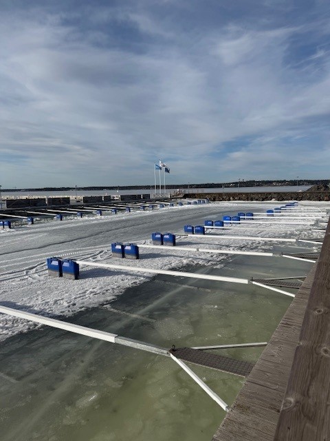 Nu är bommarna och vattenslangarna utlagda och vi inväntar med spänning öppet vatten så vi kan börja med att koppla ihop bryggorna, när kan det bli...?